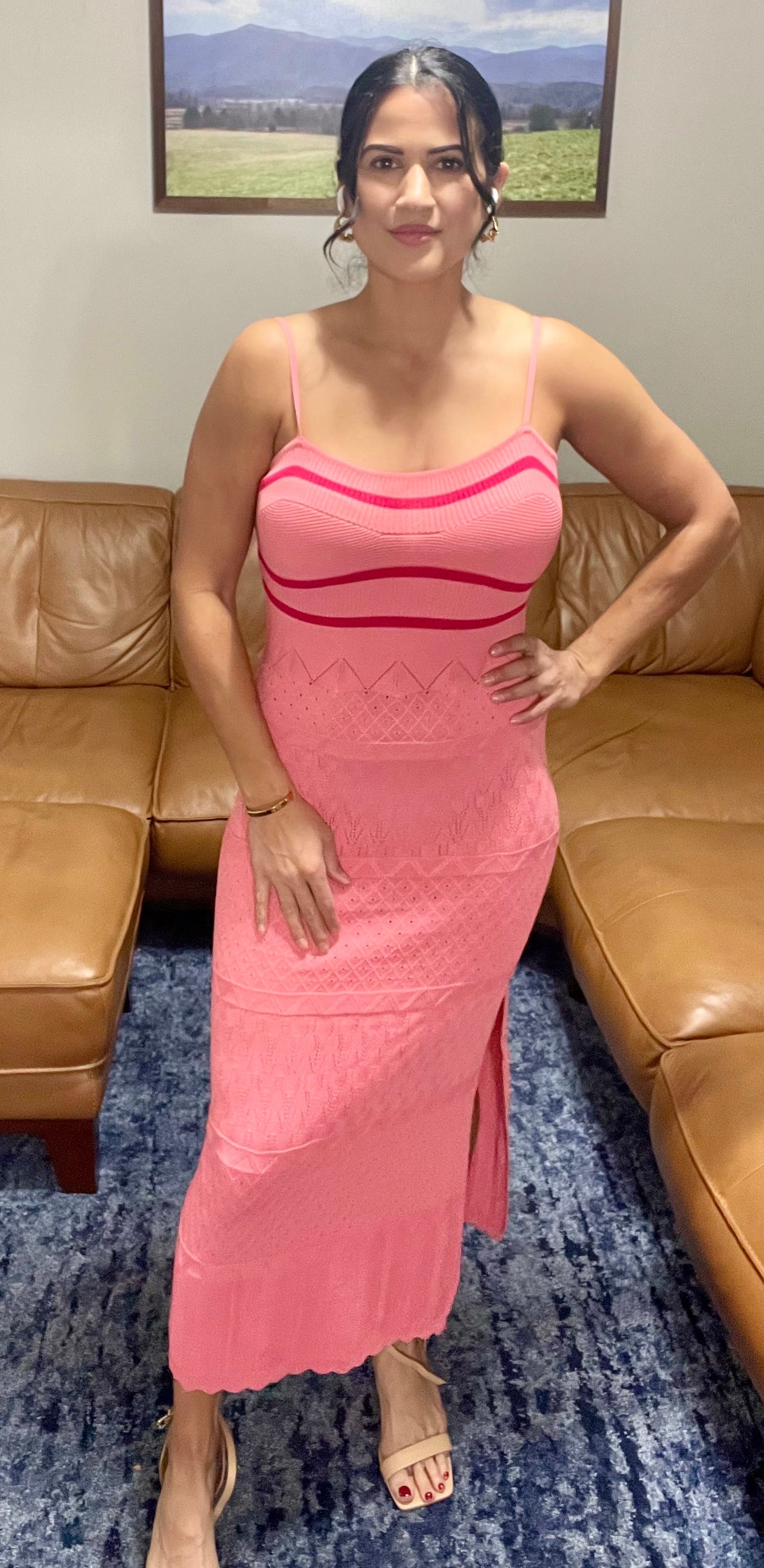 Pointelle adjustable spaghetti strap midi knit bodycon dress with side slit and contrast line detailing.