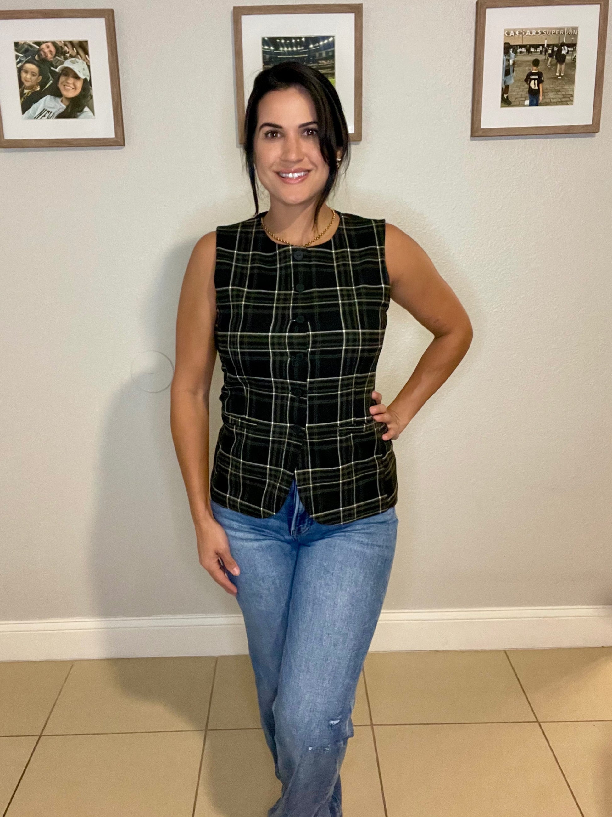 Round Neck Button Down Check Woven Vest-OS